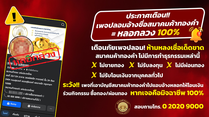 สมาคมค้าทองคำขอแจ้งเตือนประชาชนให้เพิ่มความระมัดระวัง หลังพบมิจฉาชีพแอบอ้างชื่อ ภาพลักษณ์ และโลโก้ของสมาคมค้าทองคำผ่านสื่อออนไลน์ เพื่อหลอกลวงประชาชนให้ซื้อทอง ลงทุน หรือผ่อนทอง โดยสร้างความเข้าใจผิดว่าสมาคมมีส่วนเกี่ยวข้องหรือเป็นผู้ให้บริการโดยตรง