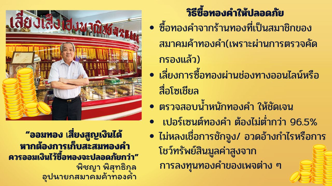 คุณพิชญา พิสุทธิกุล อุปนายกสมาคมค้าทองคำ ให้มุมมองผ่านสื่อว่า ในปัจจุบัน การซื้อขายทองคำเป็นสิ่งที่ผู้บริโภคจำนวนมากสนใจ เนื่องจากทองคำถือเป็นสินทรัพย์ที่มีค่าและสามารถลงทุนได้อย่างมั่นคง อย่างไรก็ตาม มีบางกลุ่มที่ใช้ความต้องการในการซื้อทองคำของผู้บริโภคเป็นช่องทางในการหลอกลวง สร้างความเสียหายแก่ผู้บริโภค โดยเฉพาะเรื่องการออมทอง ทั้งนี้ได้ให้คำแนะนำดังนี้