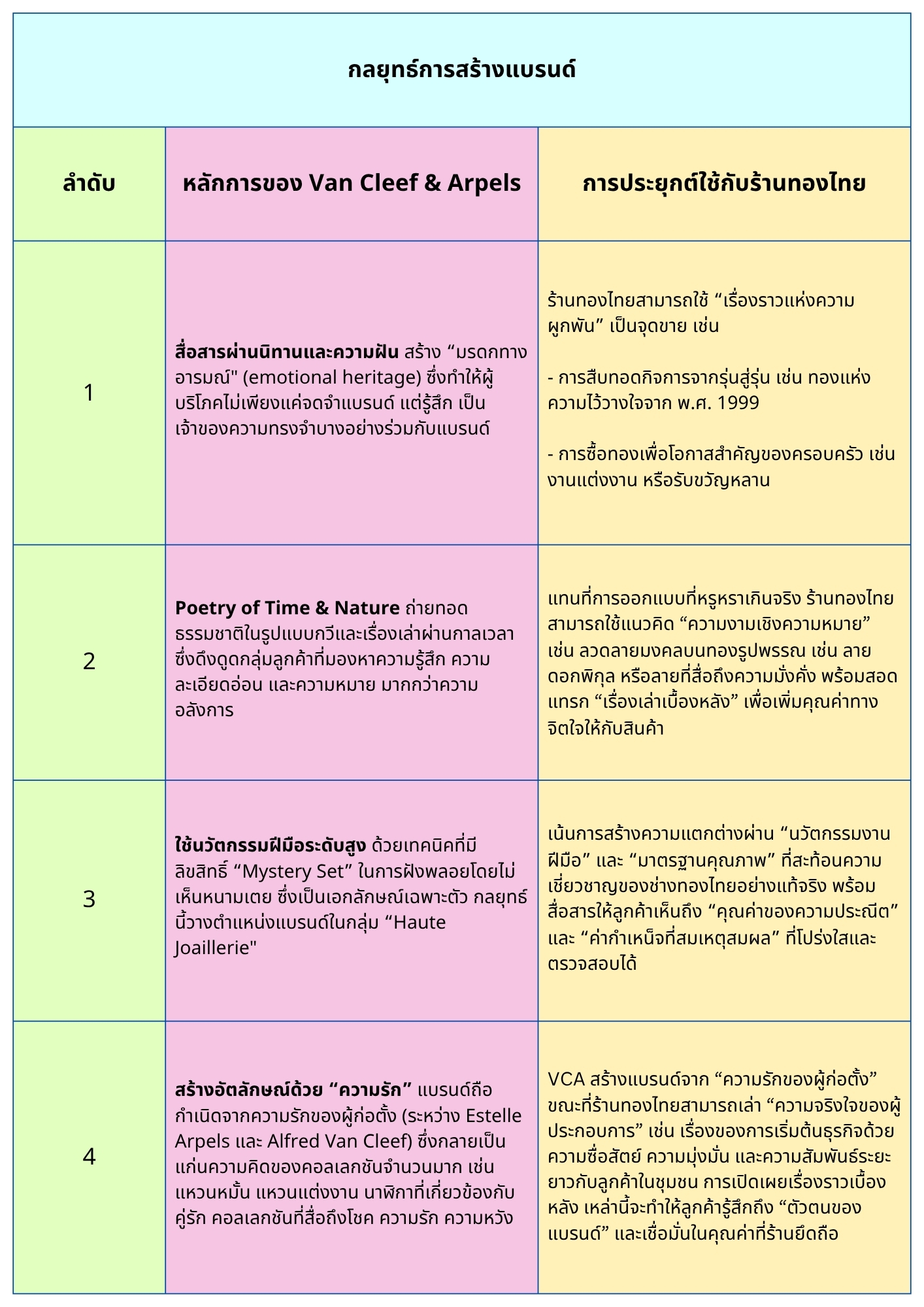 แม้ว่าธุรกิจร้านทองในประเทศไทยจะมีลักษณะแตกต่างจากธุรกิจ high jewelry อย่าง Van Cleef & Arpels (VCA) ในด้านจุดประสงค์หลัก แต่แนวทางการสร้างแบรนด์ของ VCA ยังเป็นต้นแบบที่สามารถนำมาปรับใช้เพื่อสร้างความแตกต่างและความผูกพันกับลูกค้าร้านทองได้อย่างมีประสิทธิภาพ